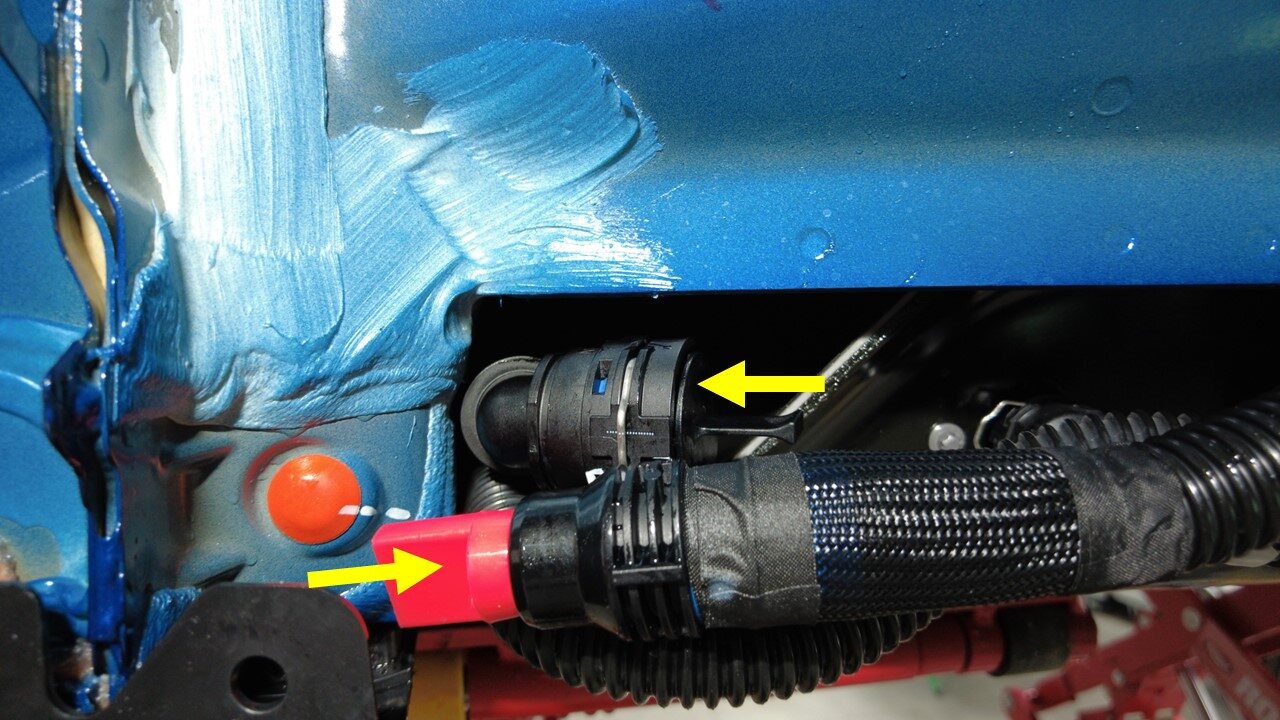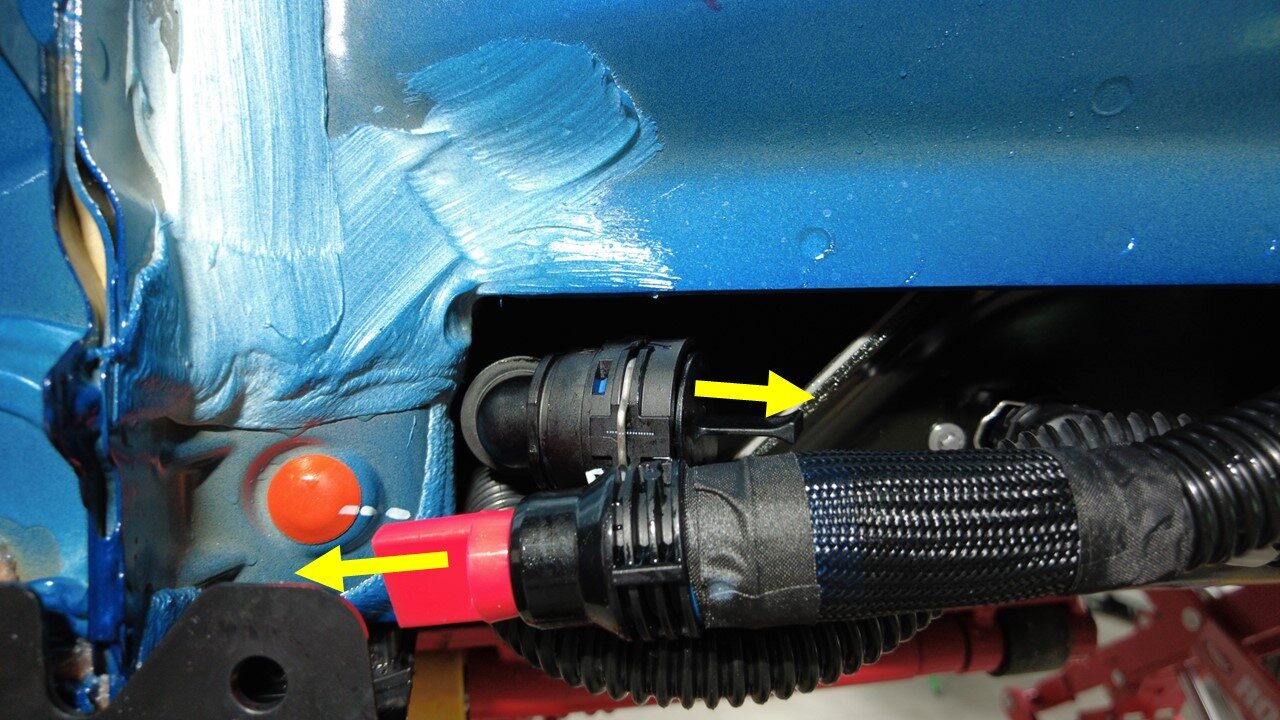 注2x connectors, Secure FRL first, Seat LV battery connection and push black connector lock inwards to secure, Engage green locking tab when fully seated.