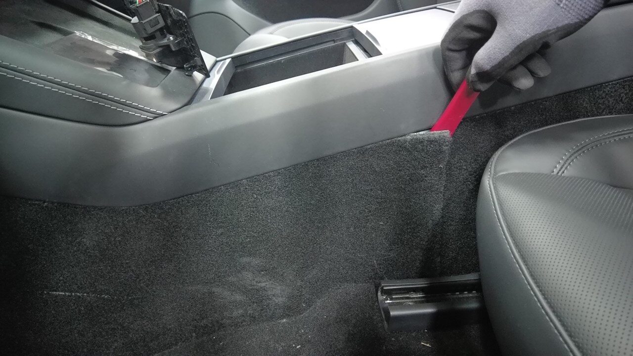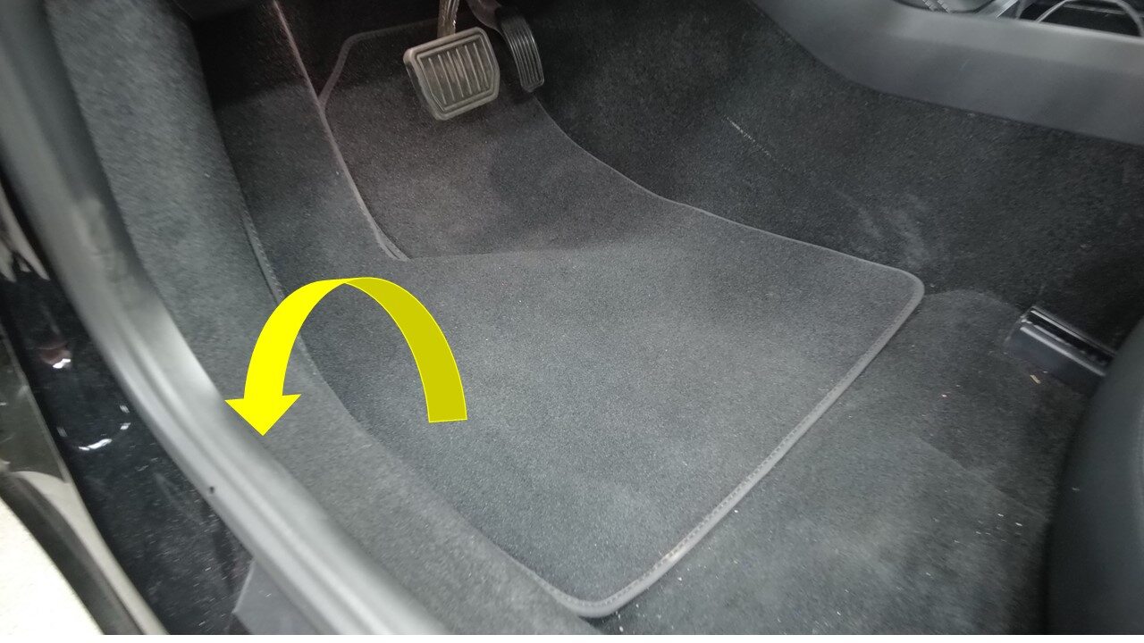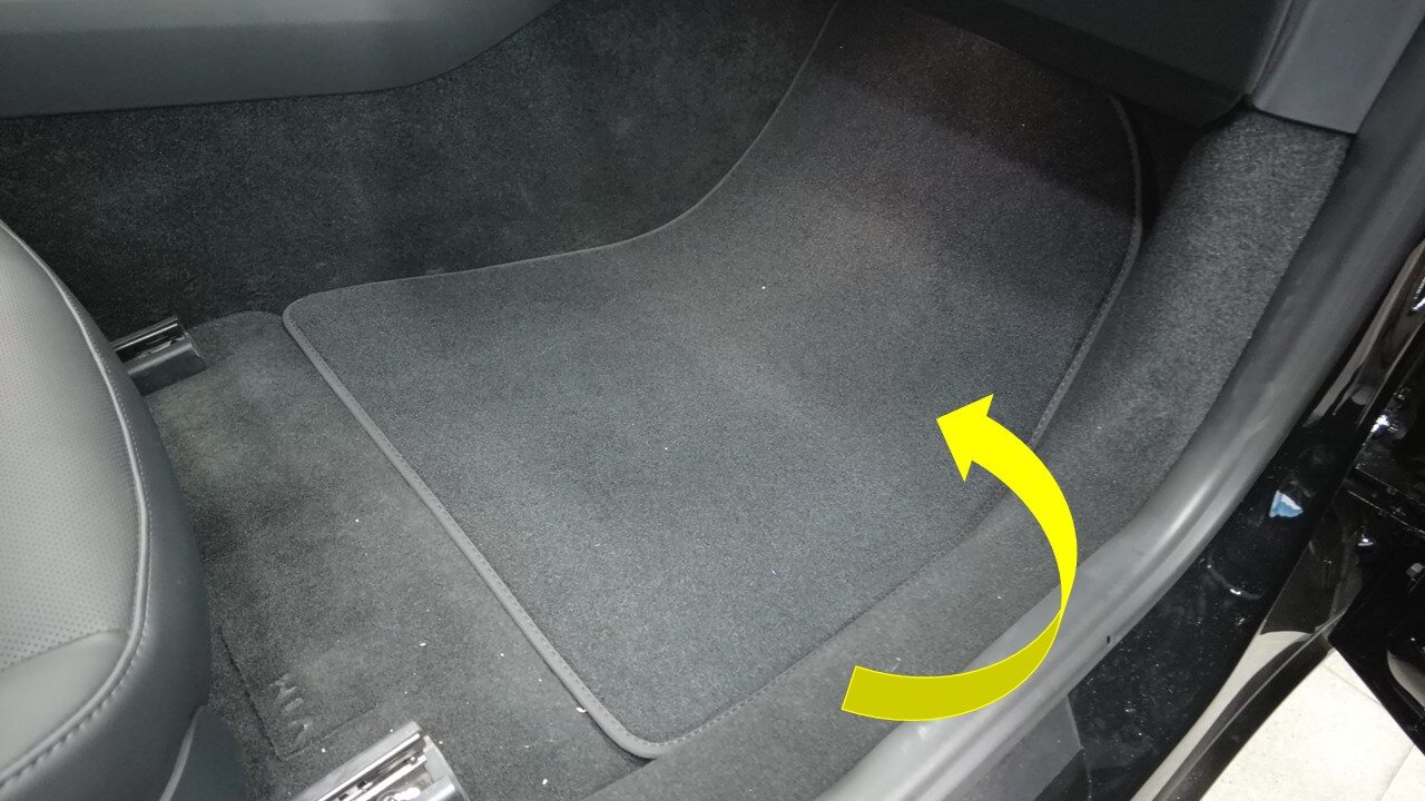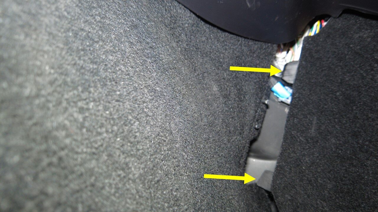 注2x clips, Lift center piece and pull carpet back, Release seat harness from clips to allow carpet to fold back more.