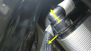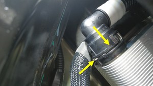 松开卡子,将后驱动单元冷却液出口软管从后驱动单元热交换器上断开,然后迅速堵住两个接头端,越快越好,以免冷却液流失。