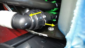将后驱动单元冷却液出口软管从动力总成回水软管上断开,然后迅速堵住两个接头端,越快越好,以免冷却液流失。