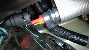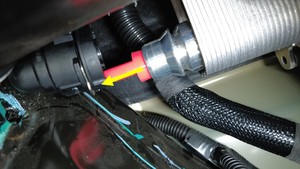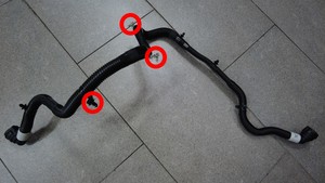 拆卸接头端的堵头,越快越好,以免冷却液流失,然后将后驱动单元冷却液出口软管安装到动力总成回流软管上。
