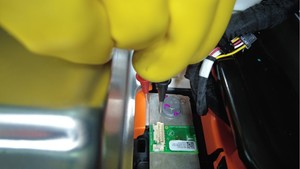 - 测量电压期间,请协助人员将烟火电池断接开关放置到高压电池内,以备安装。务必将连接器针脚与新的烟火电池断接开关对齐,然后将烟火电池断接开关向下按压到母排上。