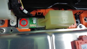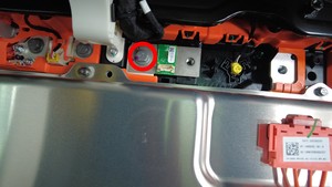 安装新的螺栓(2 个),将烟火电池断接开关固定到高压电池,紧固后,使用油性记号笔标记螺栓。