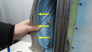 - 将驾驶位座椅靠背饰板固定件(7 个)从驾驶位座椅靠背框架上松开,然后松开遮盖座椅靠背框架上部的定位板。