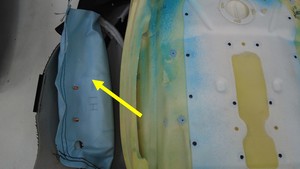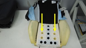 将驾驶位侧气囊安装到气囊滑槽中,然后将气囊滑槽连同其内部气囊一起插入座椅靠背泡沫上的凹槽中。