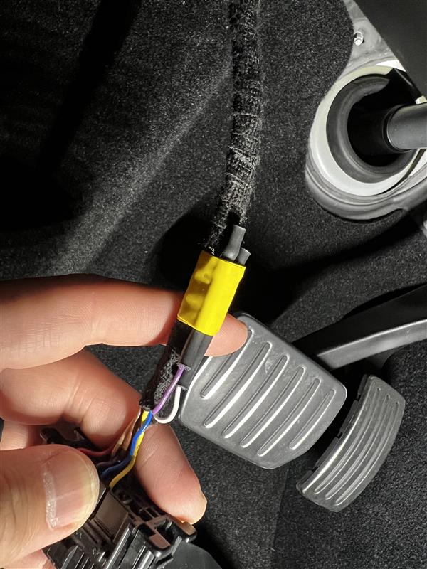 - 粘贴胶带,将处理好的针脚 3 和 针脚 11 接线端子紧固到车载诊断系统 (OBD) 电线线束丛上。