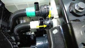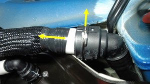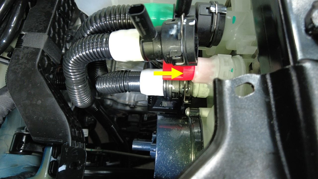松开卡子,断开高压电池回路软管,然后尽快堵住软管和高压电池管,以免冷却液流失。