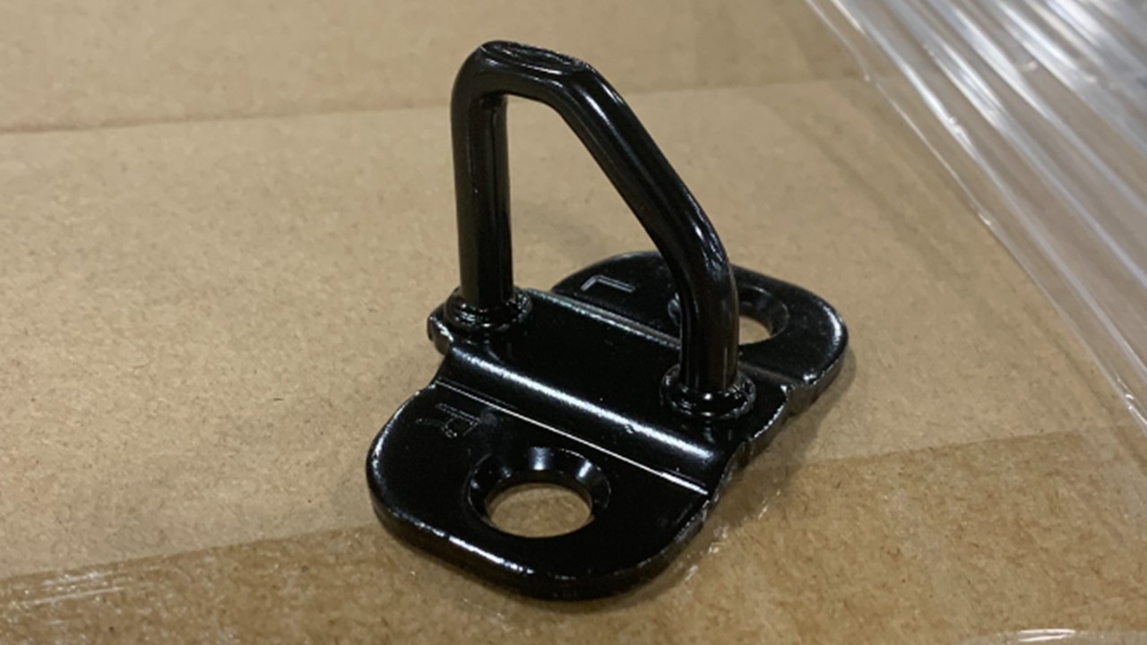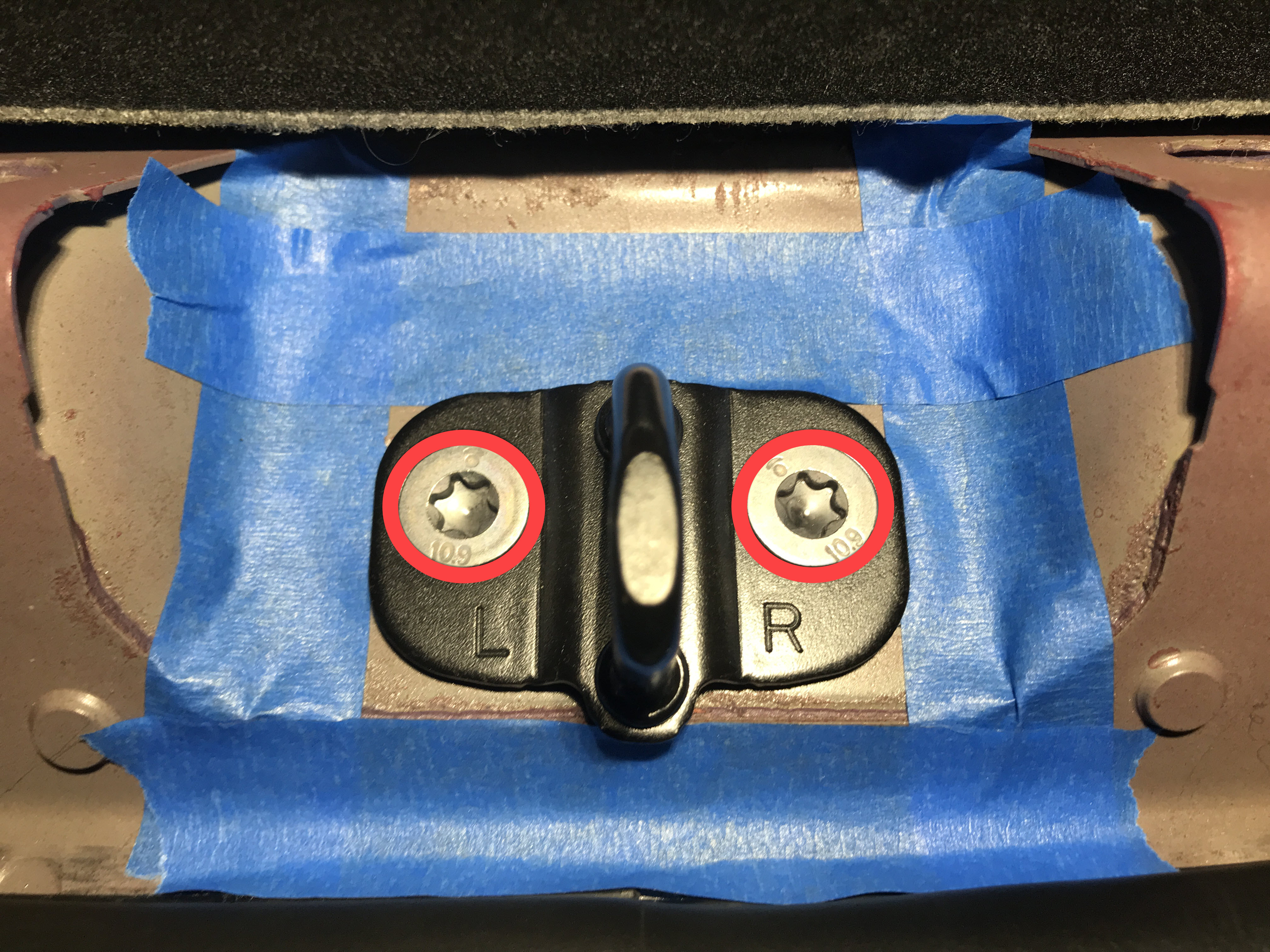 - 将后备撞销与车身上的遮蔽胶带对齐,然后手动拧紧将后备箱撞销固定到车身的螺栓。