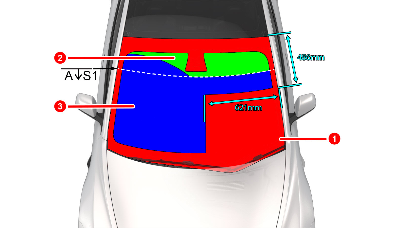 • 熔块区域(沿挡风玻璃外侧边缘的喷漆区域)。