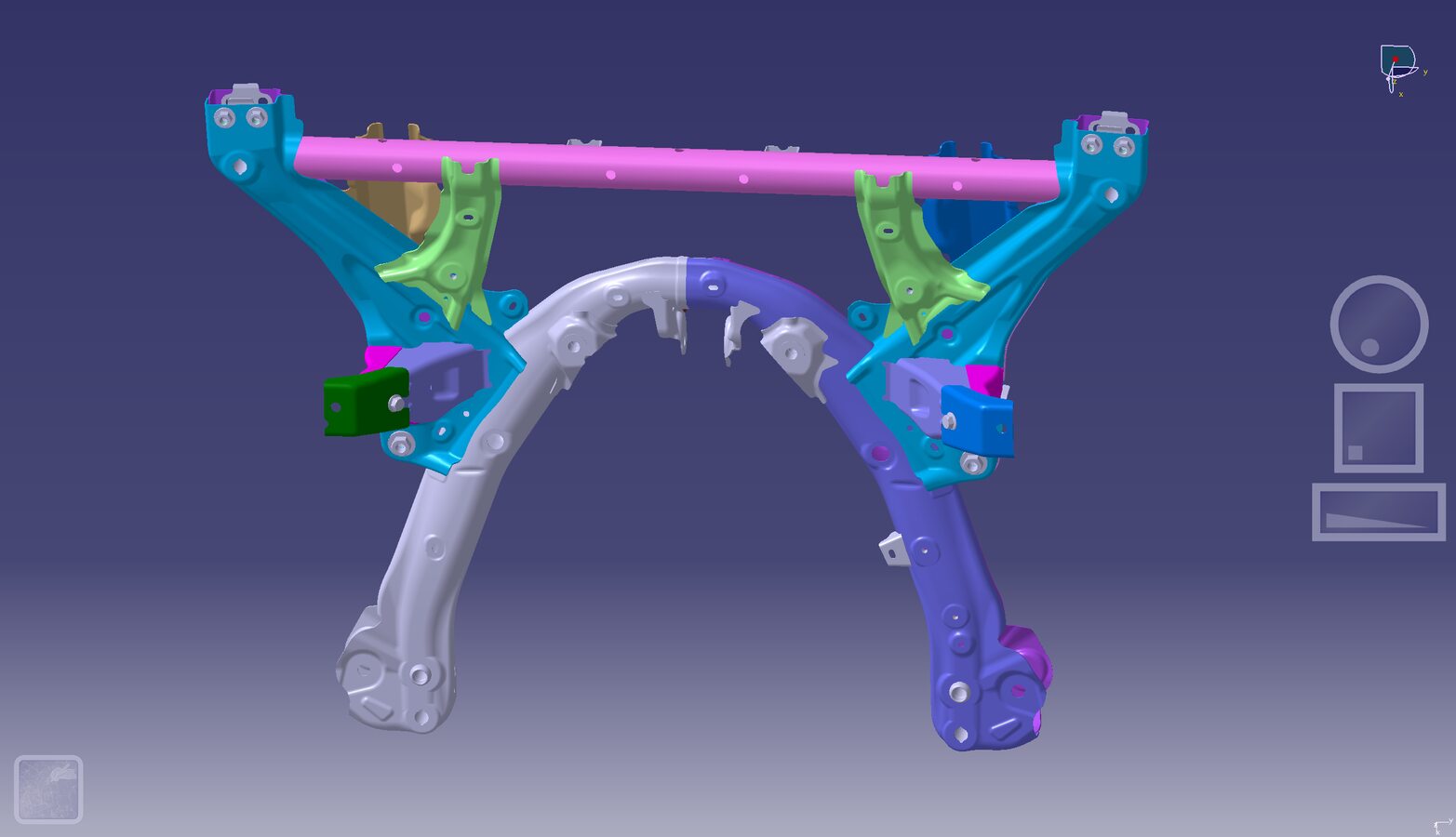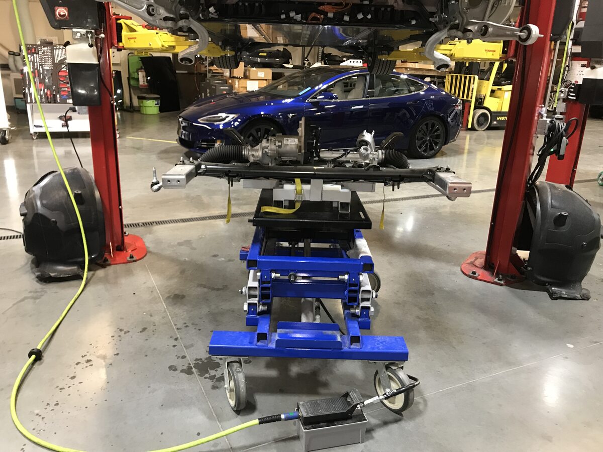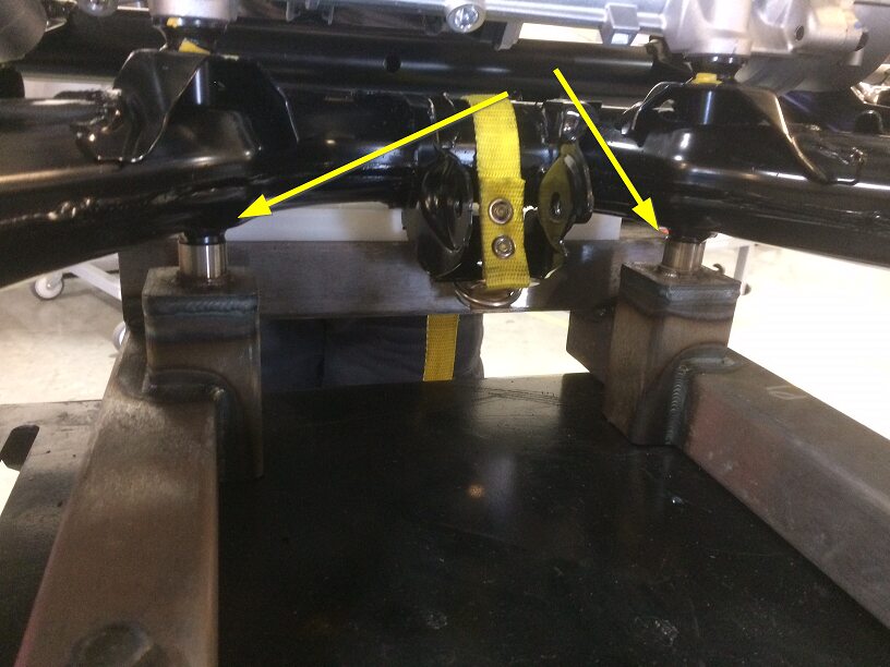 - 在协助下,升起前副车架举升工具以支撑前副车架。