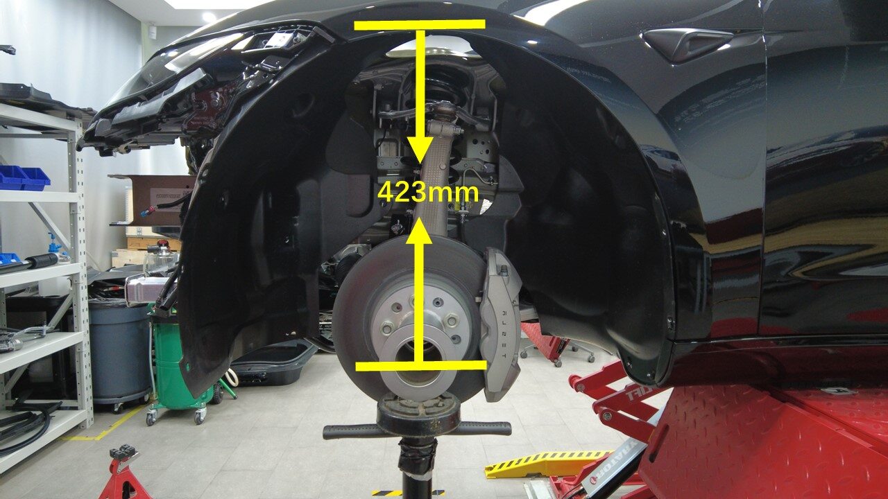 - 测量翼子板底部到车轴中心的距离,确保左侧悬架设置高度接近行驶高度(423 毫米)。