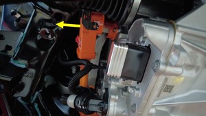 - 将连接器与后驱动单元对齐,然后在完全锁紧连接器之前拆下高压电气连接器杆锁。
