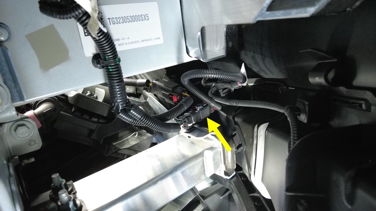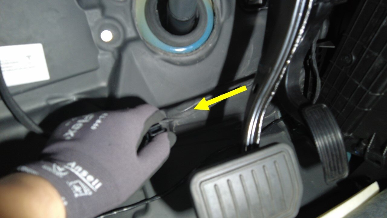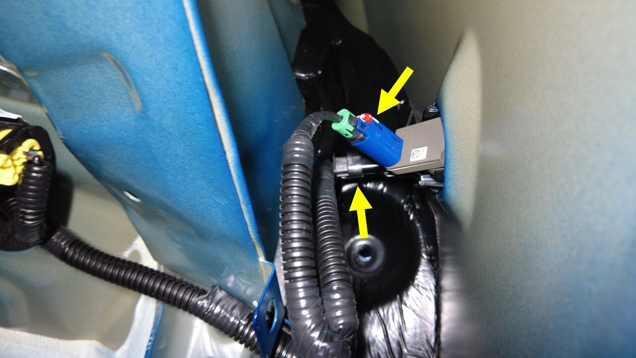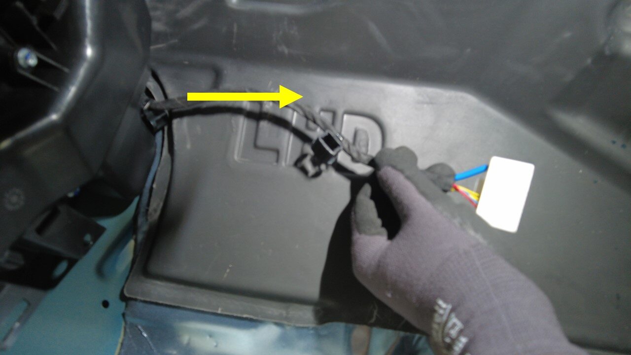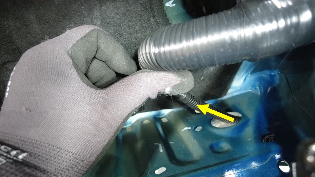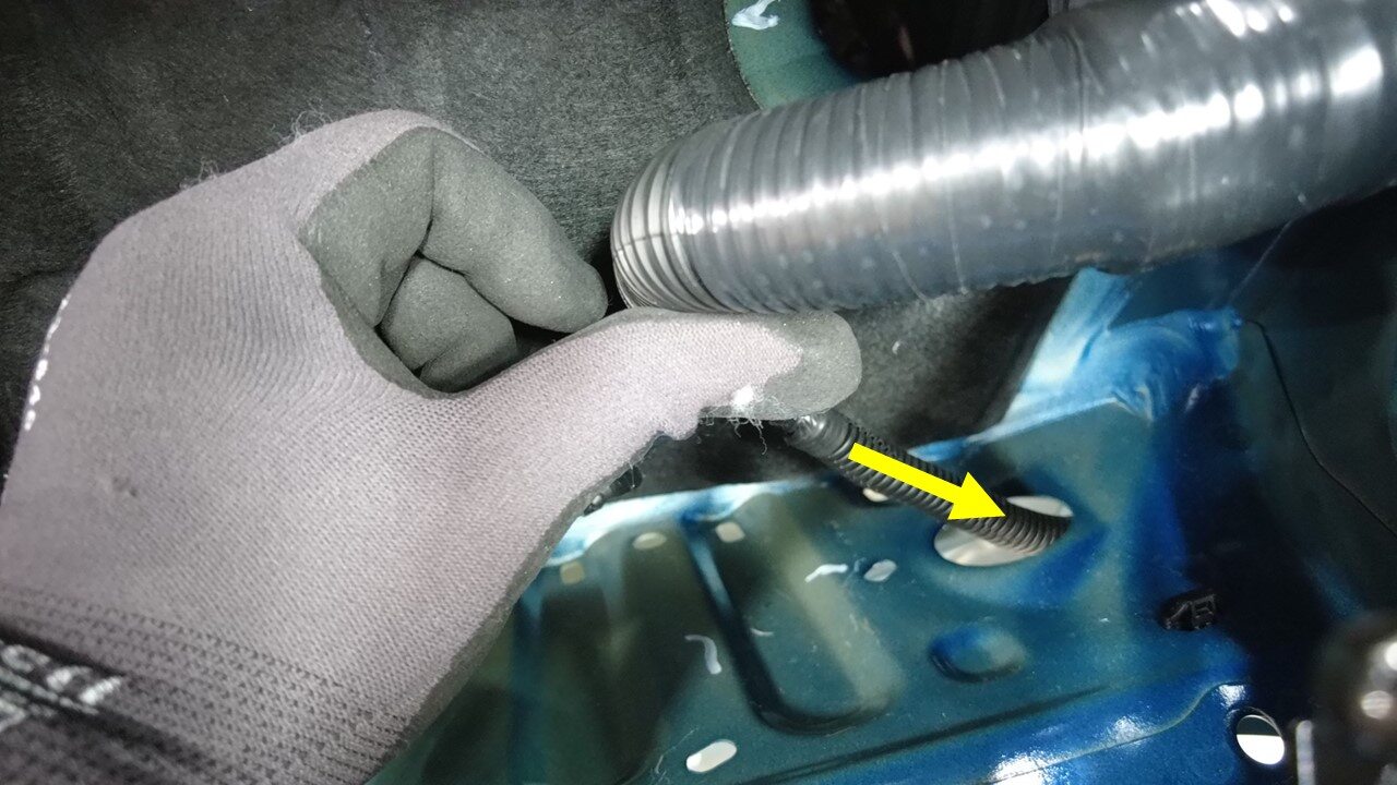 注确保塑料外壳方向正确,夹子朝向车架纵梁;将线束向下送入饰板后面