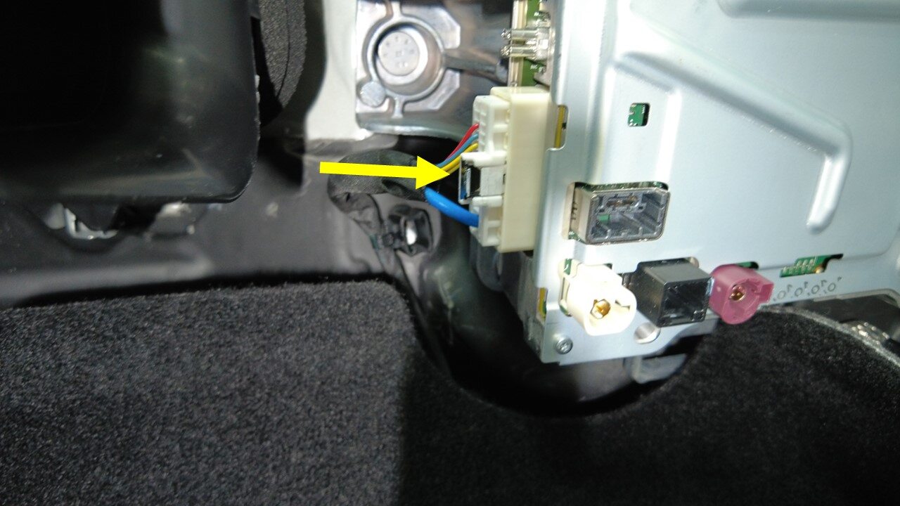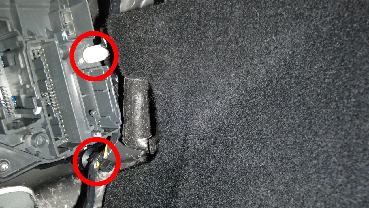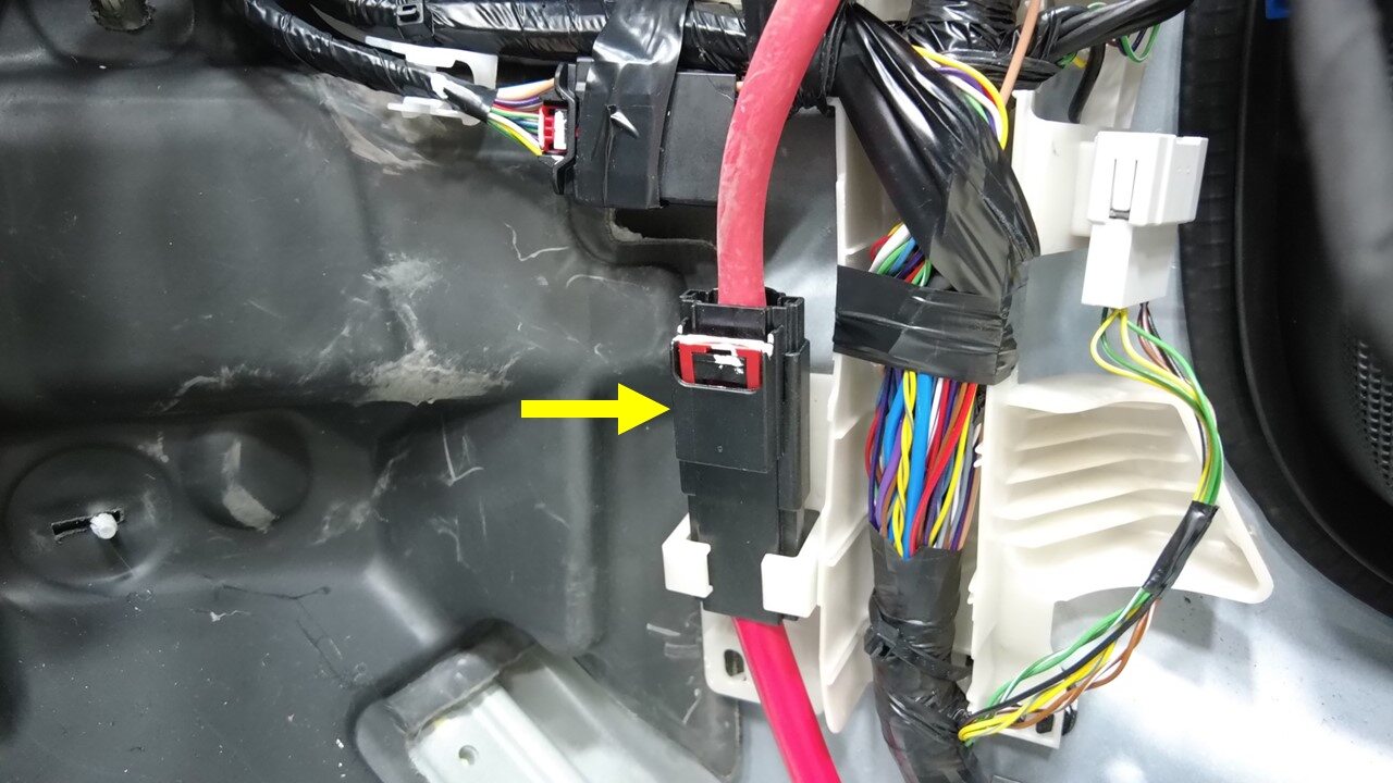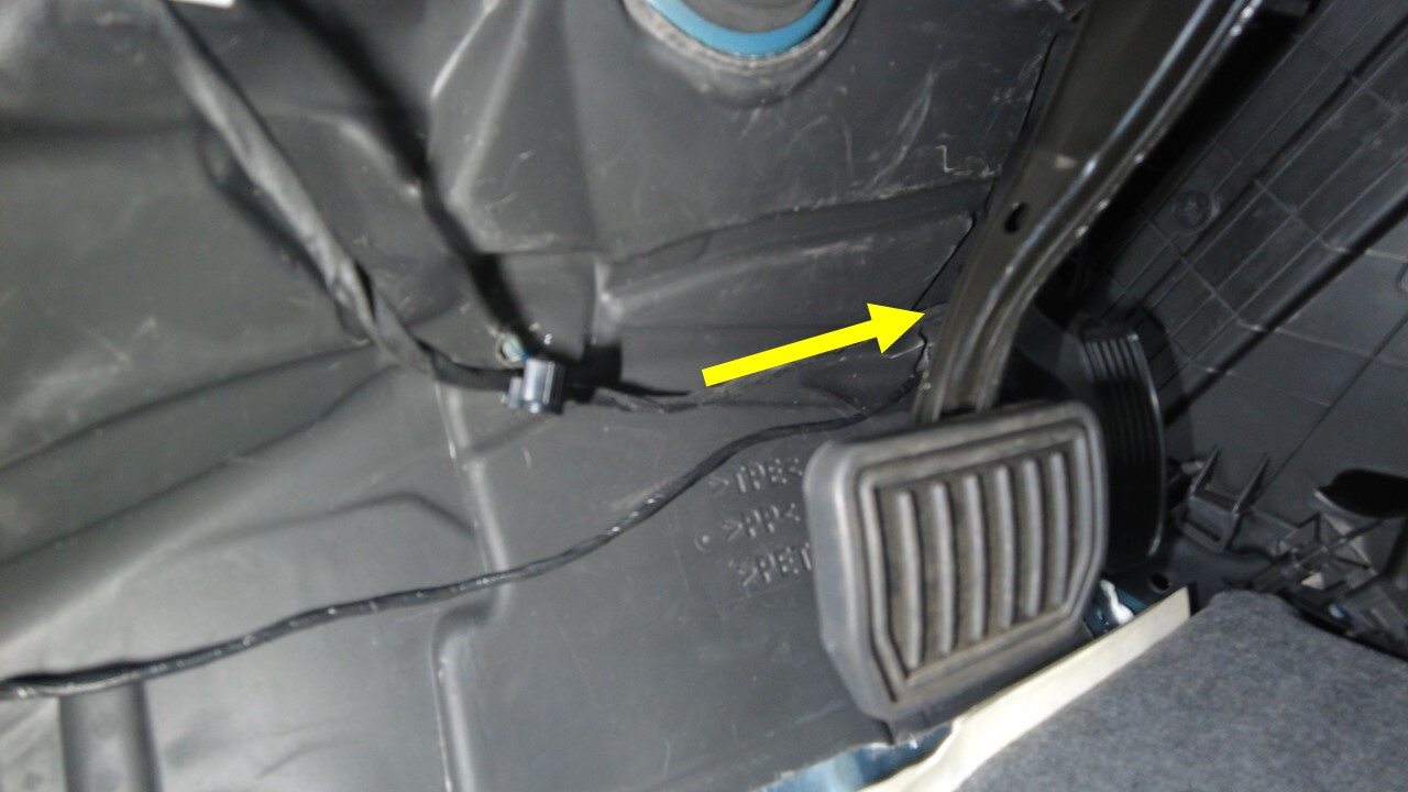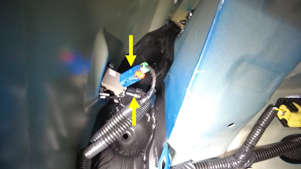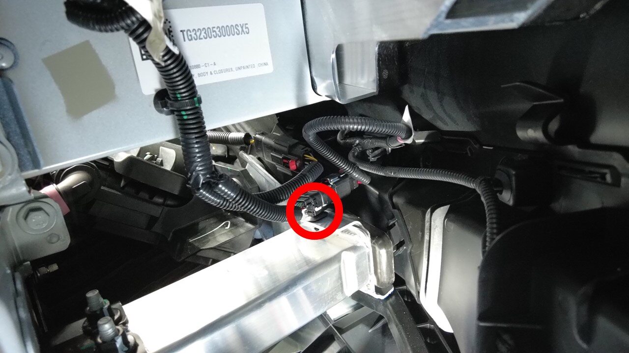 注确保塑料外壳方向正确,夹子朝向车架纵梁;将线束向下送入饰板后面