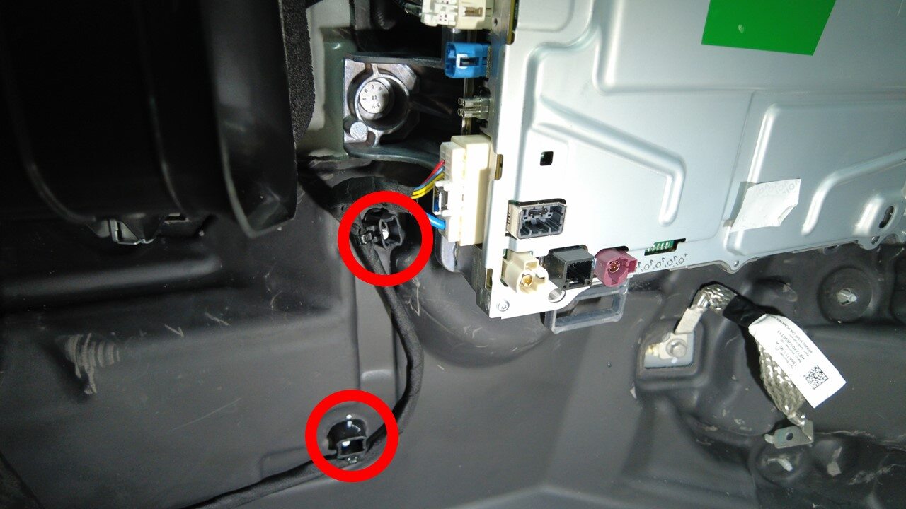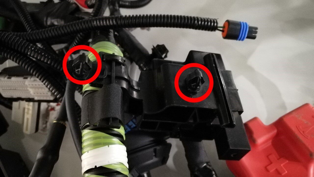 注1 个锁定连接器,1 个树形头卡子/1 个粘性夹;接合锁片;清洁白车身支架区域并将线束粘性夹(如适用)固定到旧的 VIN 上;白车身上留孔的情况下,无需改造线束;将树形头卡子固定到白车身支架孔上即可