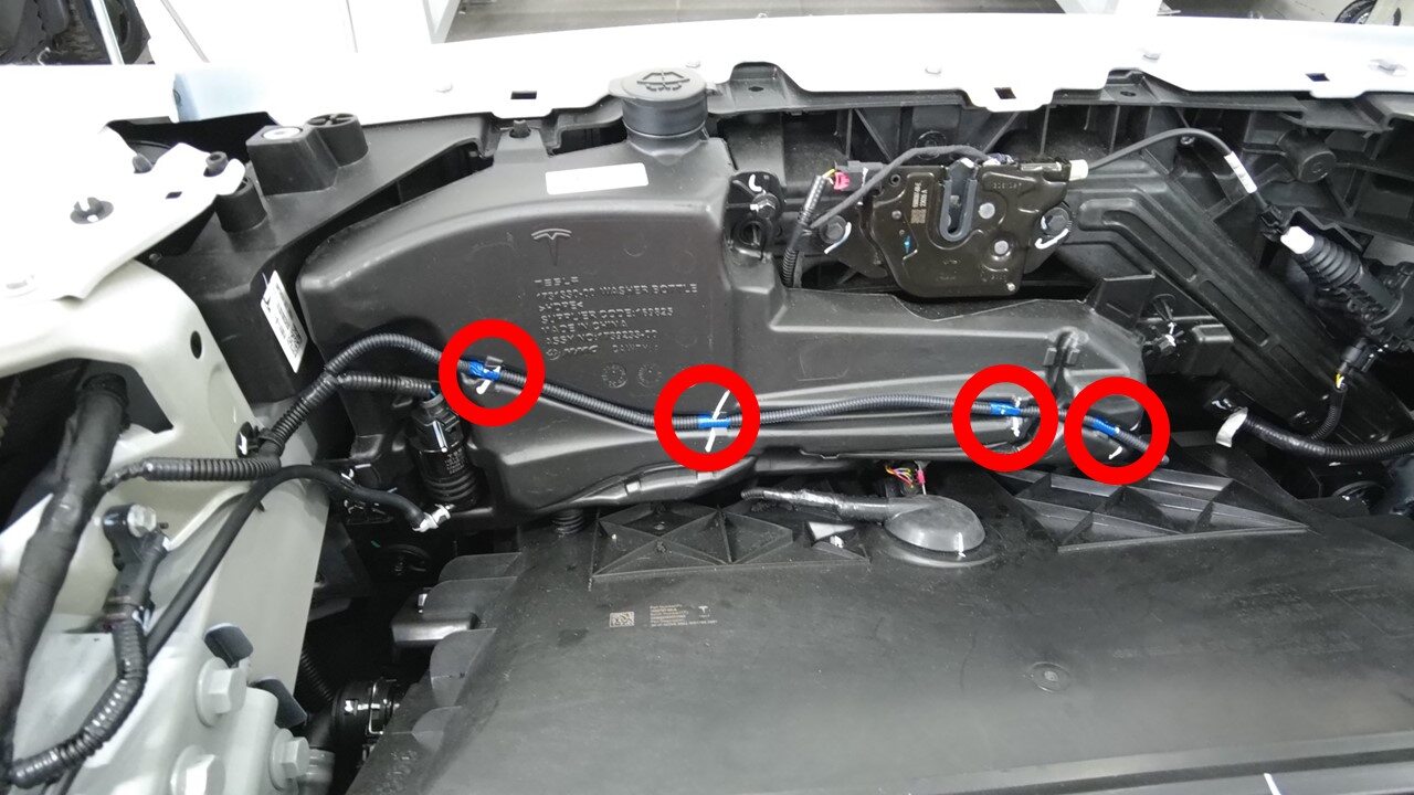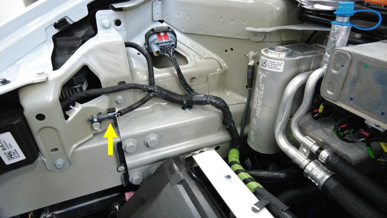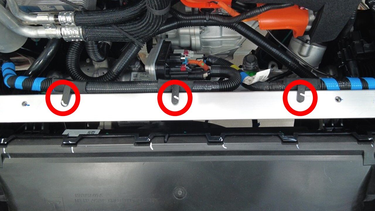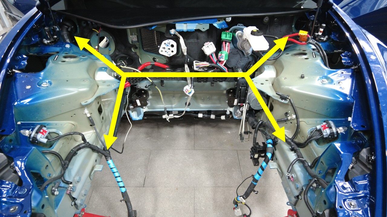 - 将前部线束的右侧从轮毂内衬排布到前备箱区域