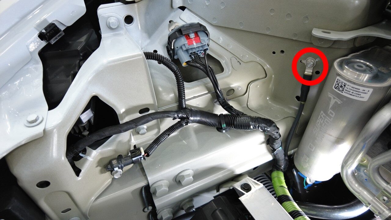 安装用于固定左前减震塔处前部线束接地端子的螺栓