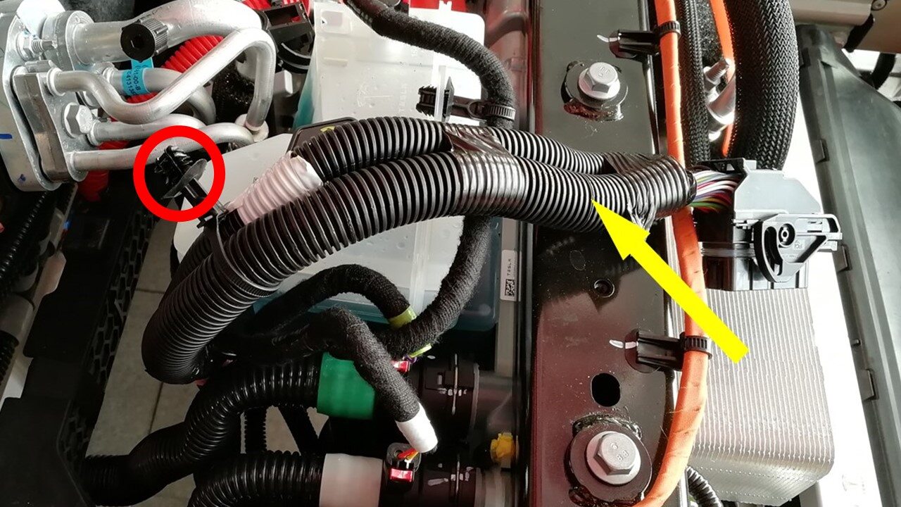 注务必将右侧分支排布到空调压缩机高压线束下方