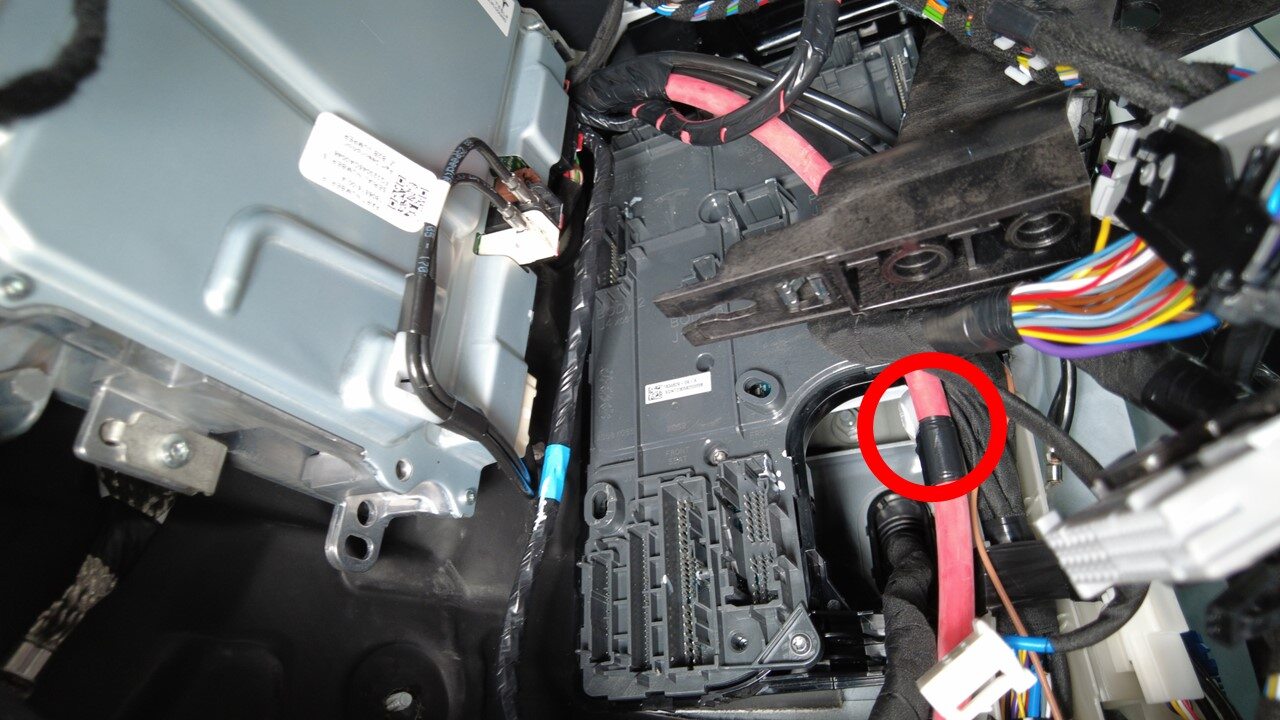 - 拆下并弃用将直流-直流正极电缆固定到右侧车身控制器的螺母。