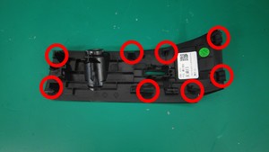 - 向上提起手动释放把手以便操作,将驾驶位车窗开关放置在车辆上,然后紧固将开关固定到车门饰板的卡子(4 个)。
