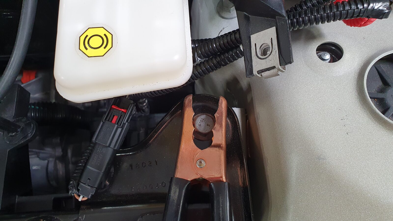 注Release positive terminal cover, Secure positive terminal to jump post, Secure negative terminal to bolt located between brake fluid reservoir and front trunk, Connect maintainer to power supply, To avoid damaging the vehicle DO NOT allow positive cable to make contact with other metal components, Never have a float charger and the LV battery simultaneously connected for any extended period of time.