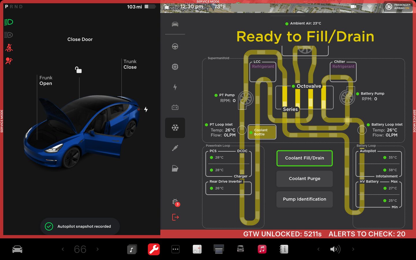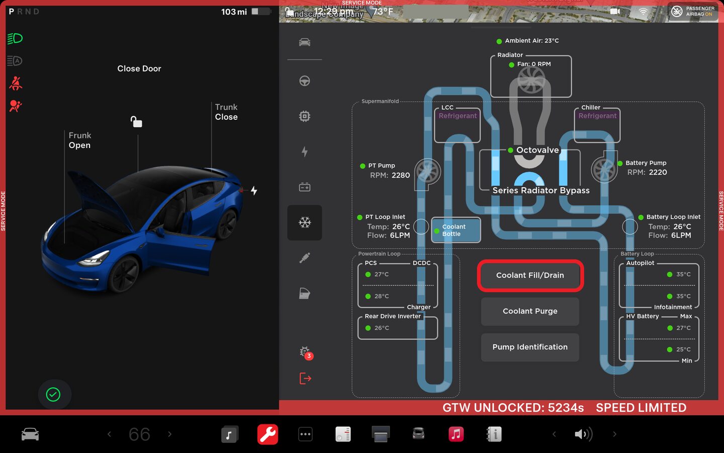 - The speed can be monitored in Garage under the PT Thermal tab. If the speed hovers at 7000 RPM, it indicates the pumps are air locked. Perform the vacuum fill again. Continue to add the coolant and purge until the coolant level reaches between the NOM and MAX Lines on the bottle.