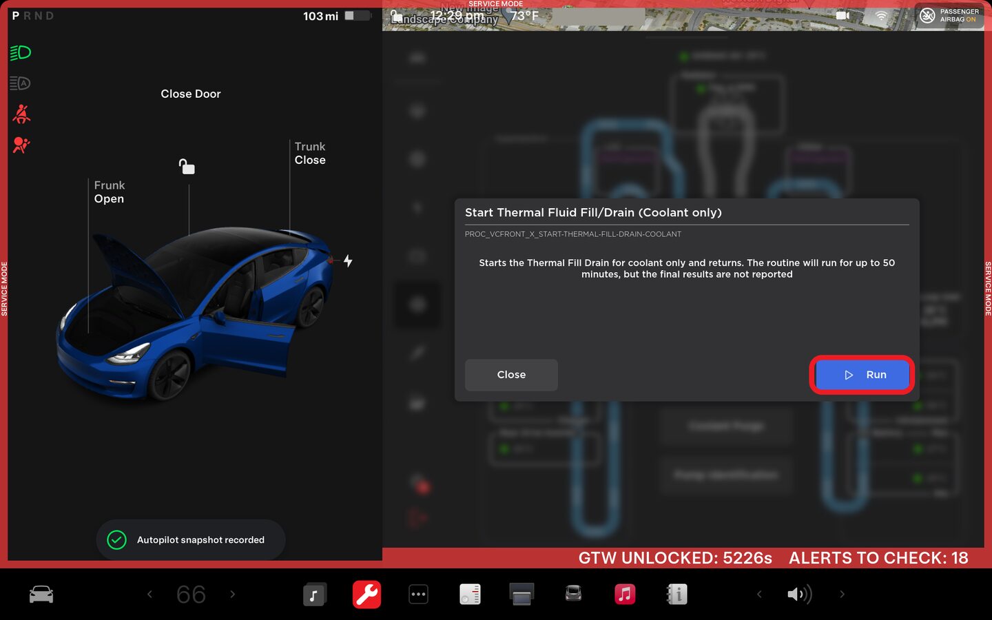注Select Thermal > Coolant System > Coolant Fill/Drain, click Run, close once routine is completed, Thermal Fill Drain routine has a 5 hour time limit, After 5 hours routine must be performed again.