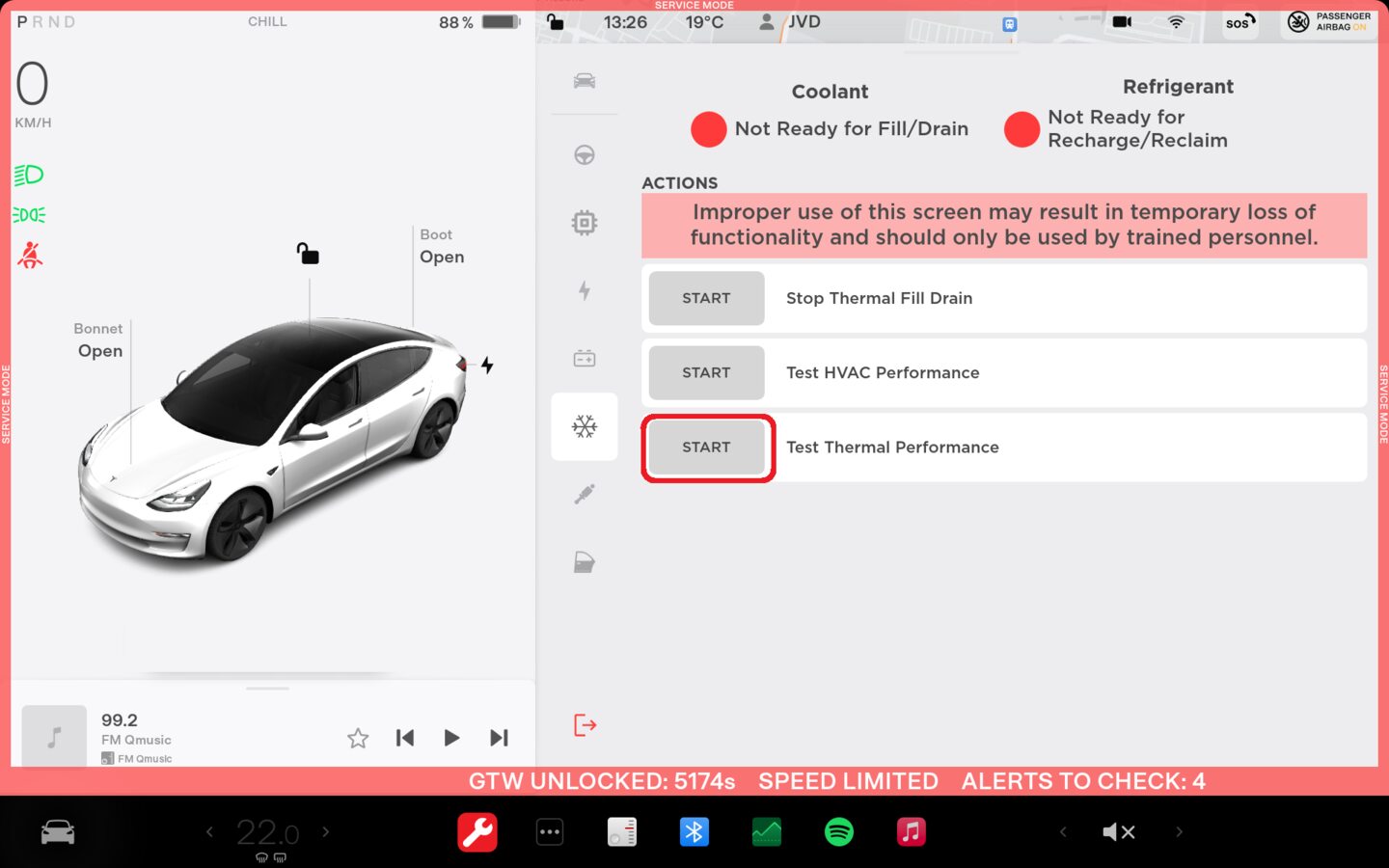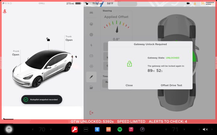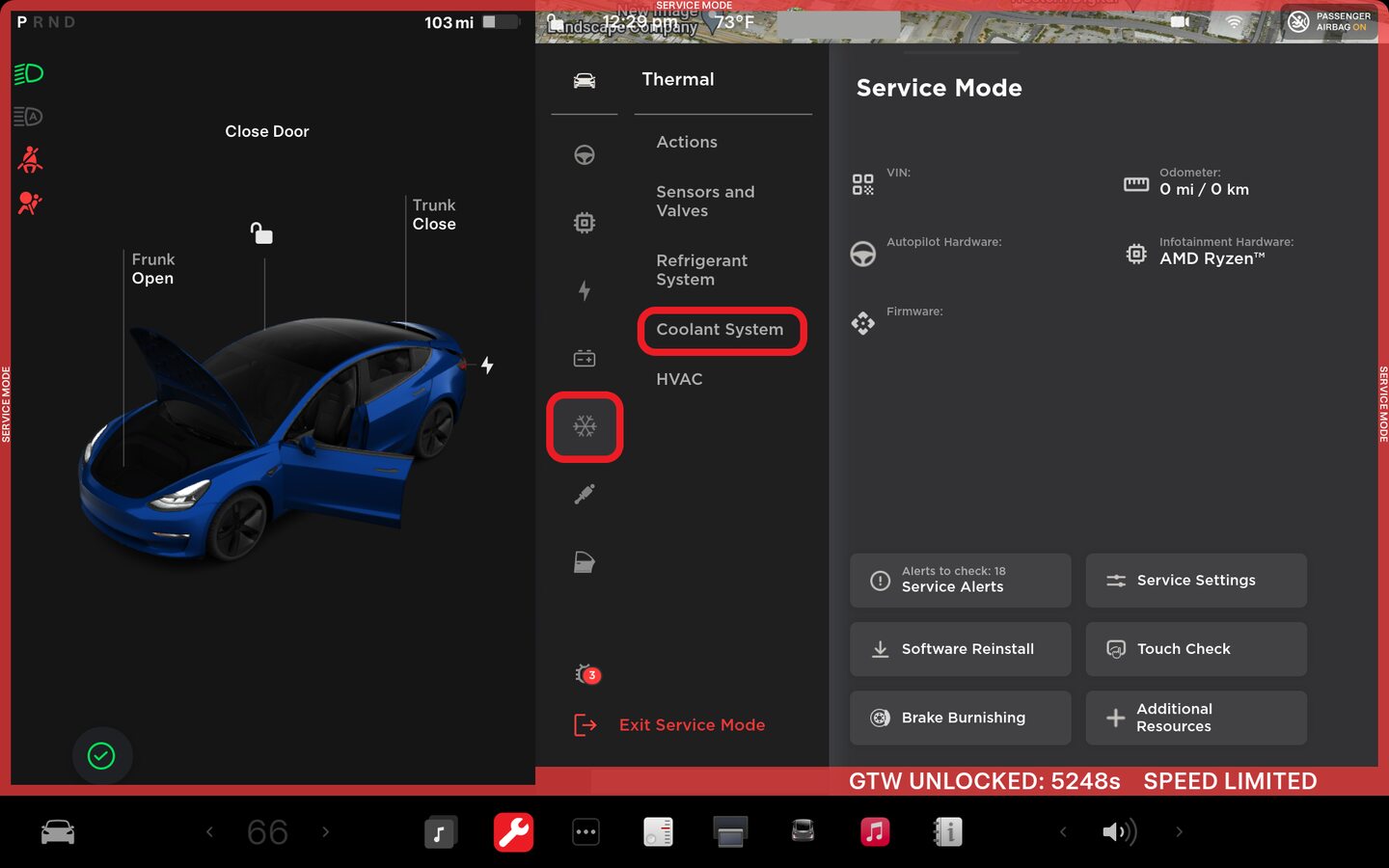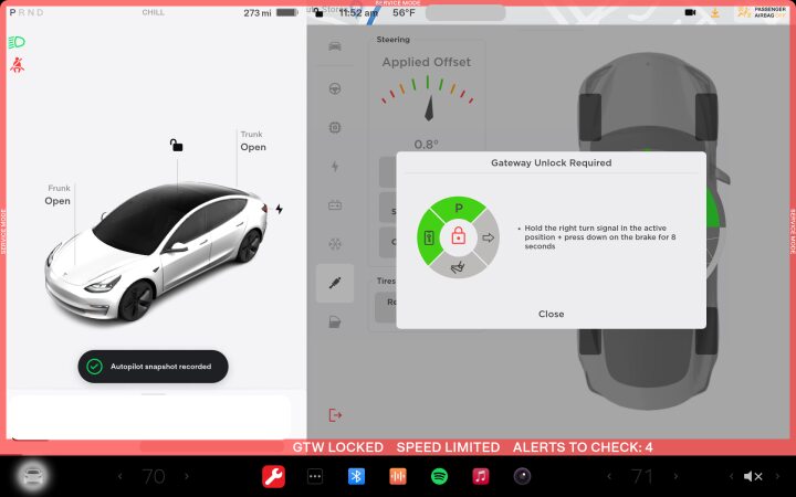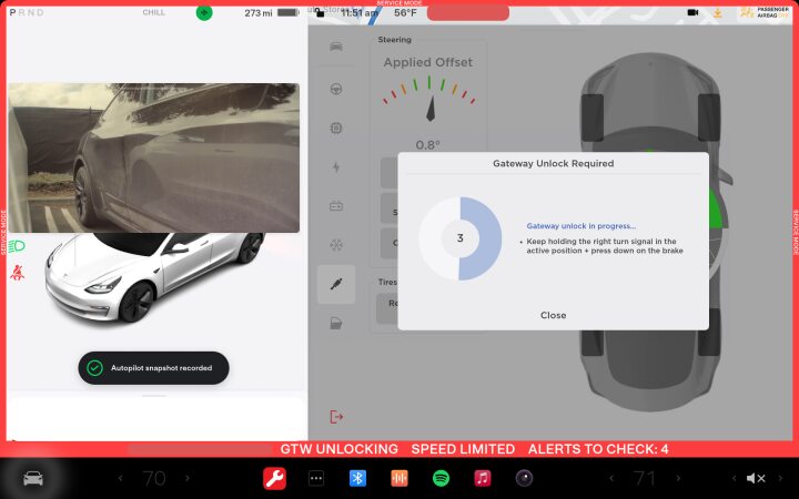 注After vehicle has been put into "Service Mode", place keycard on center console to turn on drive rails, hold down the brake pedal, while keep pressing right hand signal button simultaneously for at least 10 seconds, "GTW UNLOCKING" should pop up on the UI right next to the VIN during these 10 seconds, once gateway is unlocked "GTW UNLOCKED 5400" will be displayed on the UI next to the VIN, the gateway will remain unlocked for 90 minutes, follow steps on Toolbox article #5582900 for any additional information.