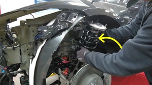 - 将螺旋弹簧和减震器总成安装到左前上方控制臂支座上。