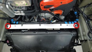 拆卸将前备箱储物单元加固支架固定到冷却风扇的螺栓(2 个),然后将支架向后滑动以留出间隙。