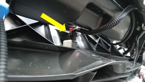将前备箱储物单元加固支架放置到冷却风扇上,然后安装将支架固定到风扇的螺栓(2 个)。
