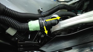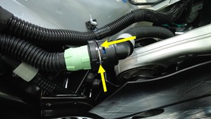 松开卡子,断开前驱动单元动力总成旁通软管,然后尽快堵住软管和动力总成回路管,以免冷却液流失。