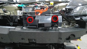 拆卸将饰板加固件固定到支架前端的螺栓(2 个)。