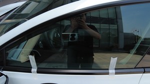 在车窗玻璃和左前车门外侧密封条上方粘贴两条遮蔽胶带,然后在玻璃与密封条相交的地方小心地切开胶带(如图所示)。