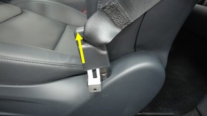 - 将座椅安全带释放工具 (1133787-00-A) 插入安全带预紧器连接件底部,将安全带从预紧器上松开。