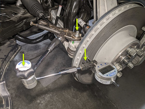 - 将制动盘偏转挠性杆安装到左前横拉杆球头螺母上,然后进行设置,以便读取读数。