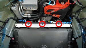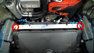 - 拆卸前备箱加固支架上的线束夹(3 个)。
