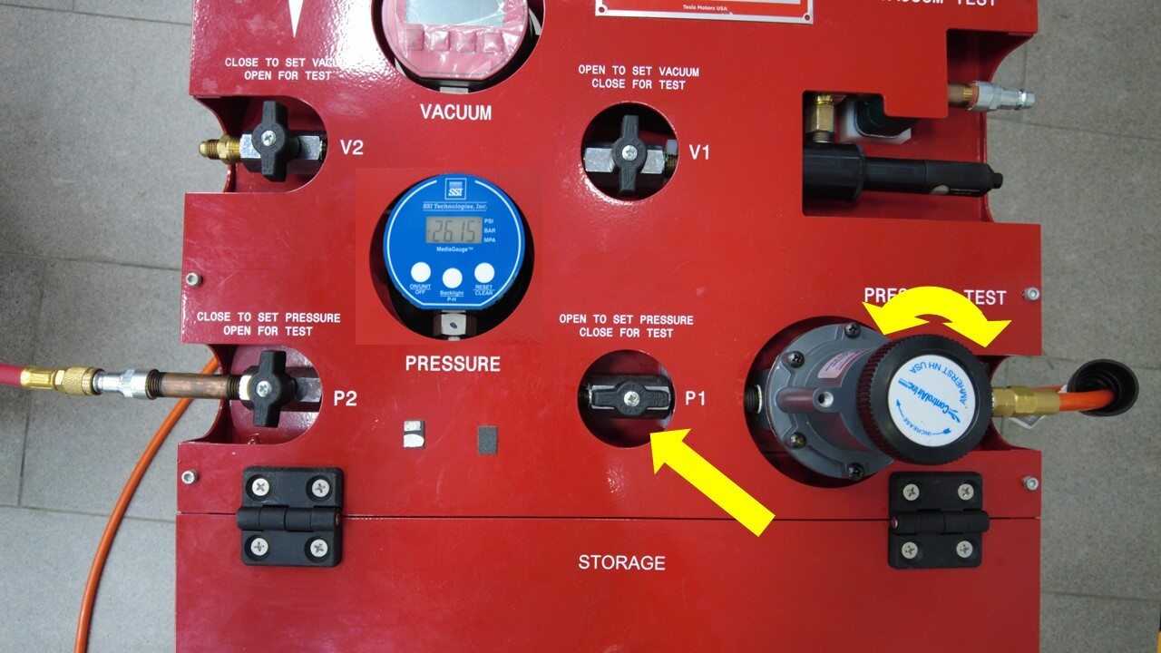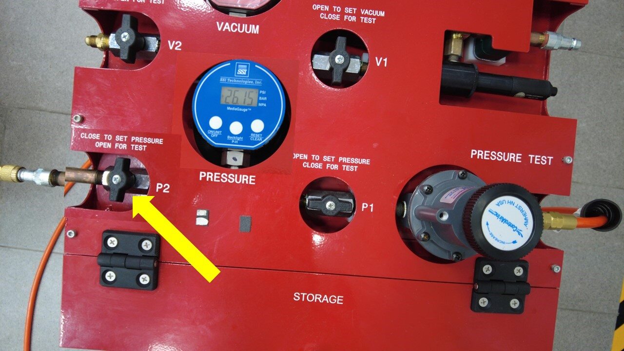 - 打开调整器阀门 P1,然后将调整器缓慢调节至 26 psi。