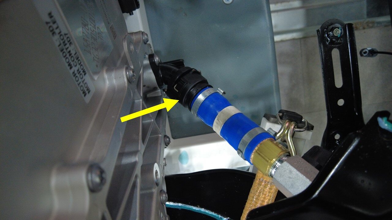 将冷却液排放和加注适配器连接到位于变流器底部的冷却液进口软管。
