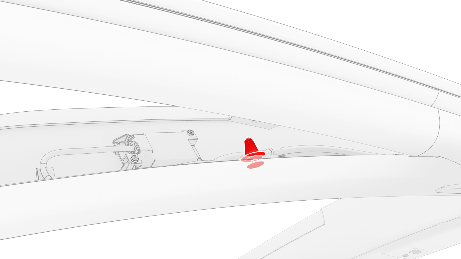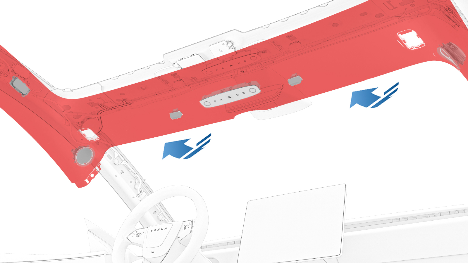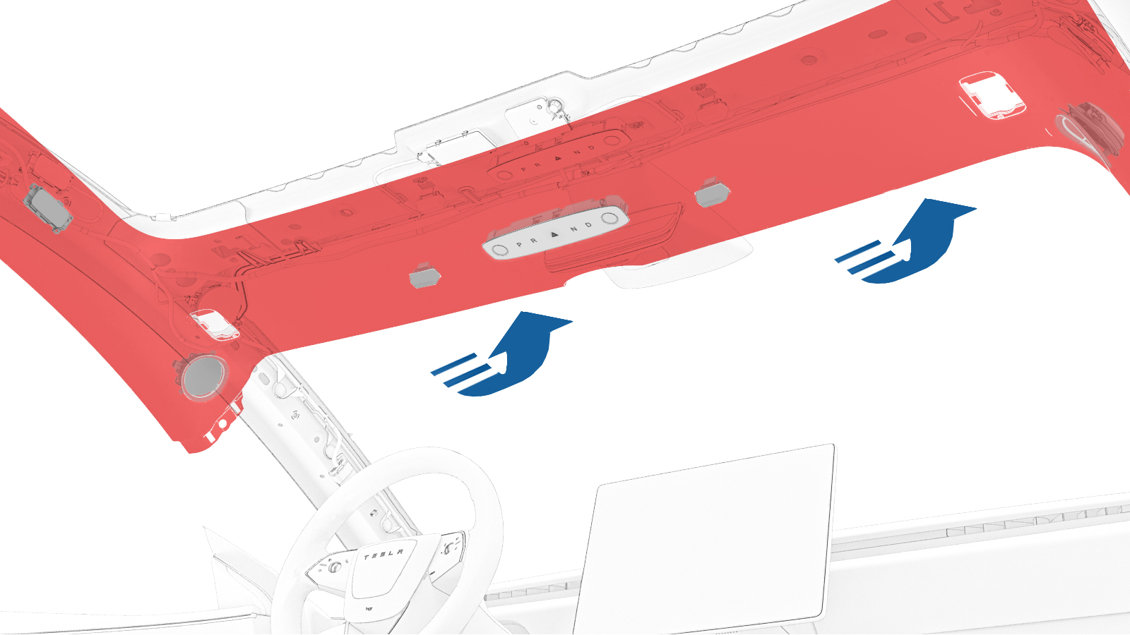松开将顶篷前部固定到车辆的卡子(6 个)和定位销。