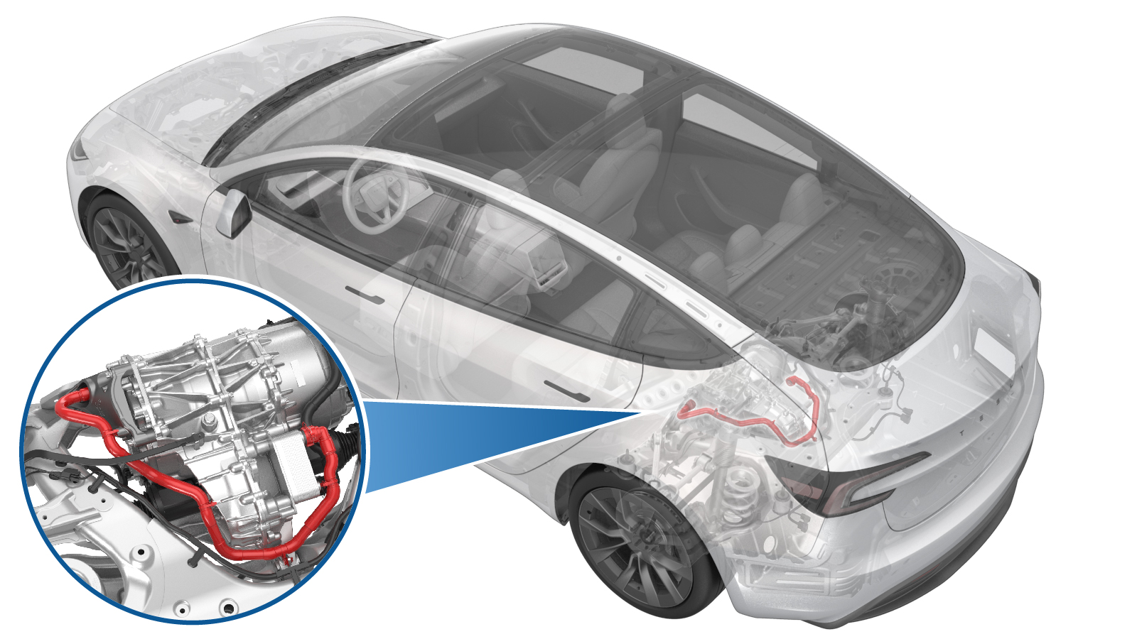 - Release clips (x4) that attach the rear drive unit inverter to oil cooler hose and remove the hose.
