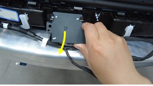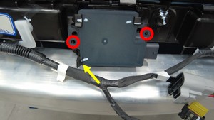 - 松开将低功耗蓝牙 (BLE) 模块固定到后饰板的锁片和定位销(2 个),然后将低功耗蓝牙 (BLE) 模块从车辆上拆下。