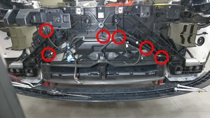 - 将前端模块 (FEM) 电气线束放置到车辆上,然后安装将电气线束固定到前端支架的卡子(6 个)。