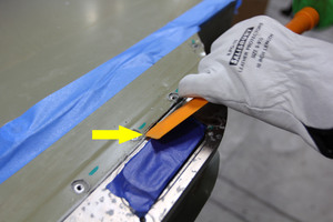 - 使用不导电楔形工具将速接板稍稍向上抬起,然后在缝隙内涂抹一滴密封剂。确保密封剂溢出速接板左右两端。使用手电筒或车间照明检查密封剂是否覆盖住了整个密封区域。根据需要再涂抹一些密封剂。