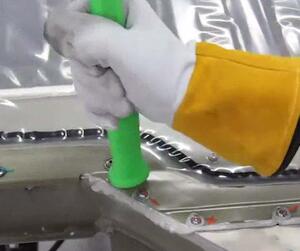 使用非破坏性刮刀和无弹力锤清除高压电池盖板左后角和右后角与速接板接触处的密封剂。