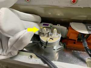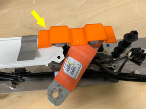 使用新的 M5 螺母(4 个)将电池组触点开关固定到高压电池仓托盘。紧固螺母,然后使用橙色油性记号笔进行标记。