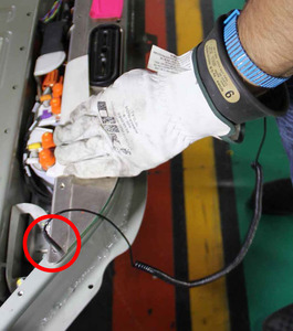 戴上防高压防静电控制腕带,然后将腕带接地连接夹到高压电池外壳边缘的螺纹孔上。