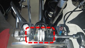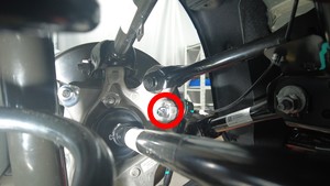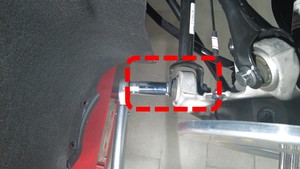 检查将左后下尾连杆固定到左后减震器的螺母,确认其扭矩,然后用油性记号笔标记螺栓和螺母。