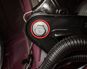 检查将右侧剪力板固定到车辆的大号螺栓,确认其扭矩,然后用油性记号笔标记螺栓。