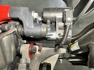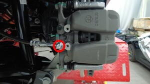 将右后制动钳安装到右后转向节上,然后安装新的螺栓,将卡钳固定到转向节上。